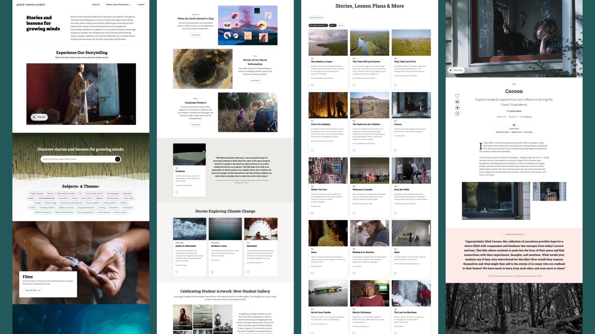 Global Oneness Project is a free multimedia platform for educators and students, and at its core is a website that contains hundreds of award-winning documentary films, photo essays, and curricula that explore cultural, environmental, and social issues. For over 17 years, as an individual contributor and, eventually, the creative director, I played a pivotal role in its visual and technological evolution. While continuously evolving with the seismic shift in education and technology, we've maintained our commitment to ensuring the site remains beautiful, inspirational, free, and universally accessible.
